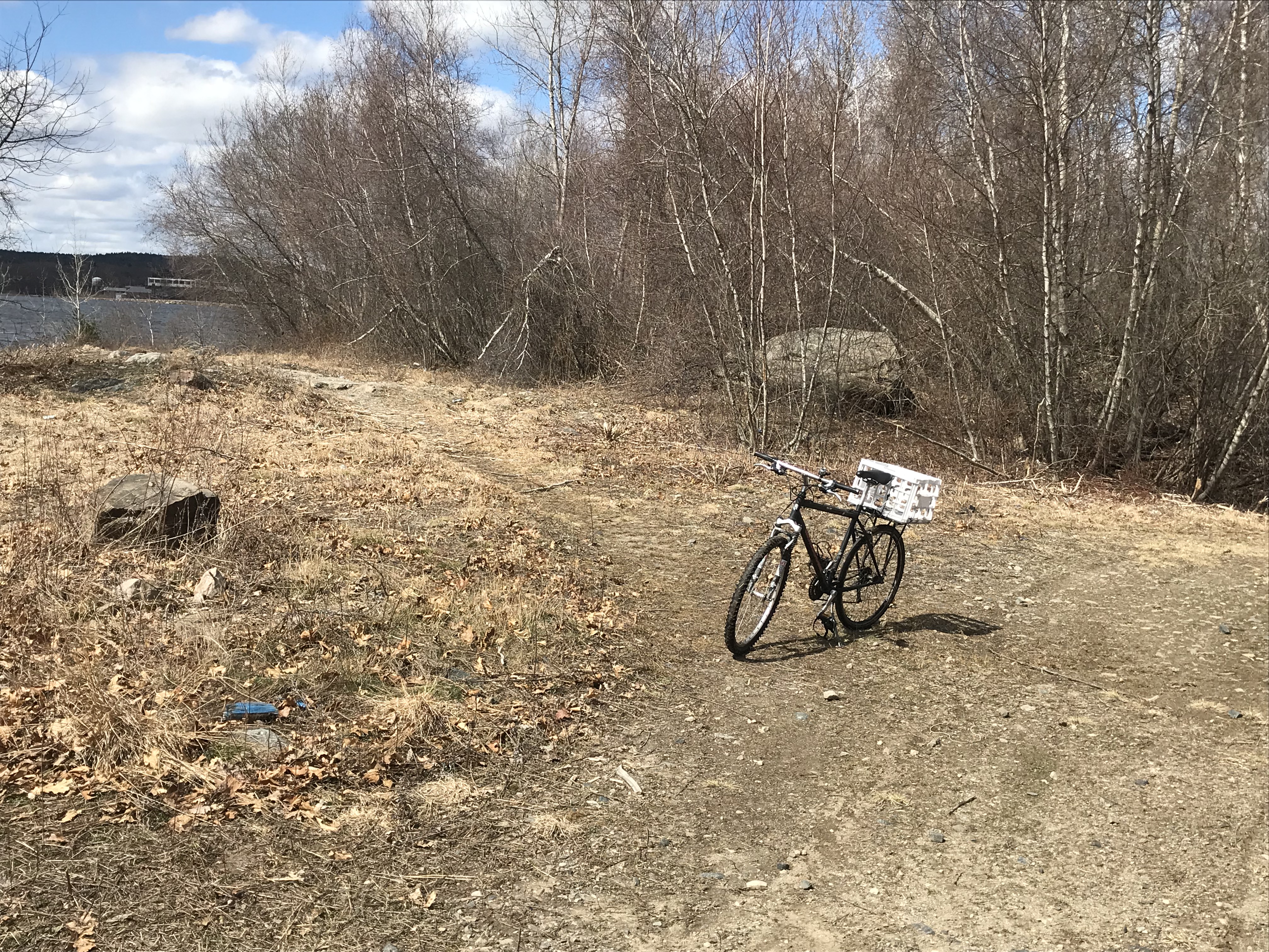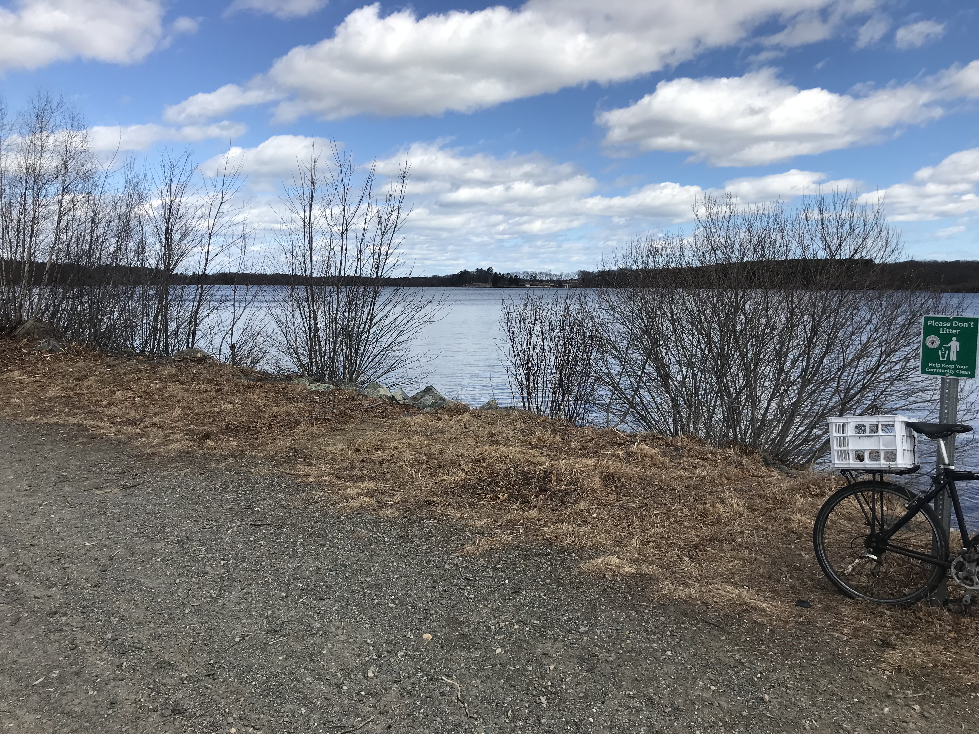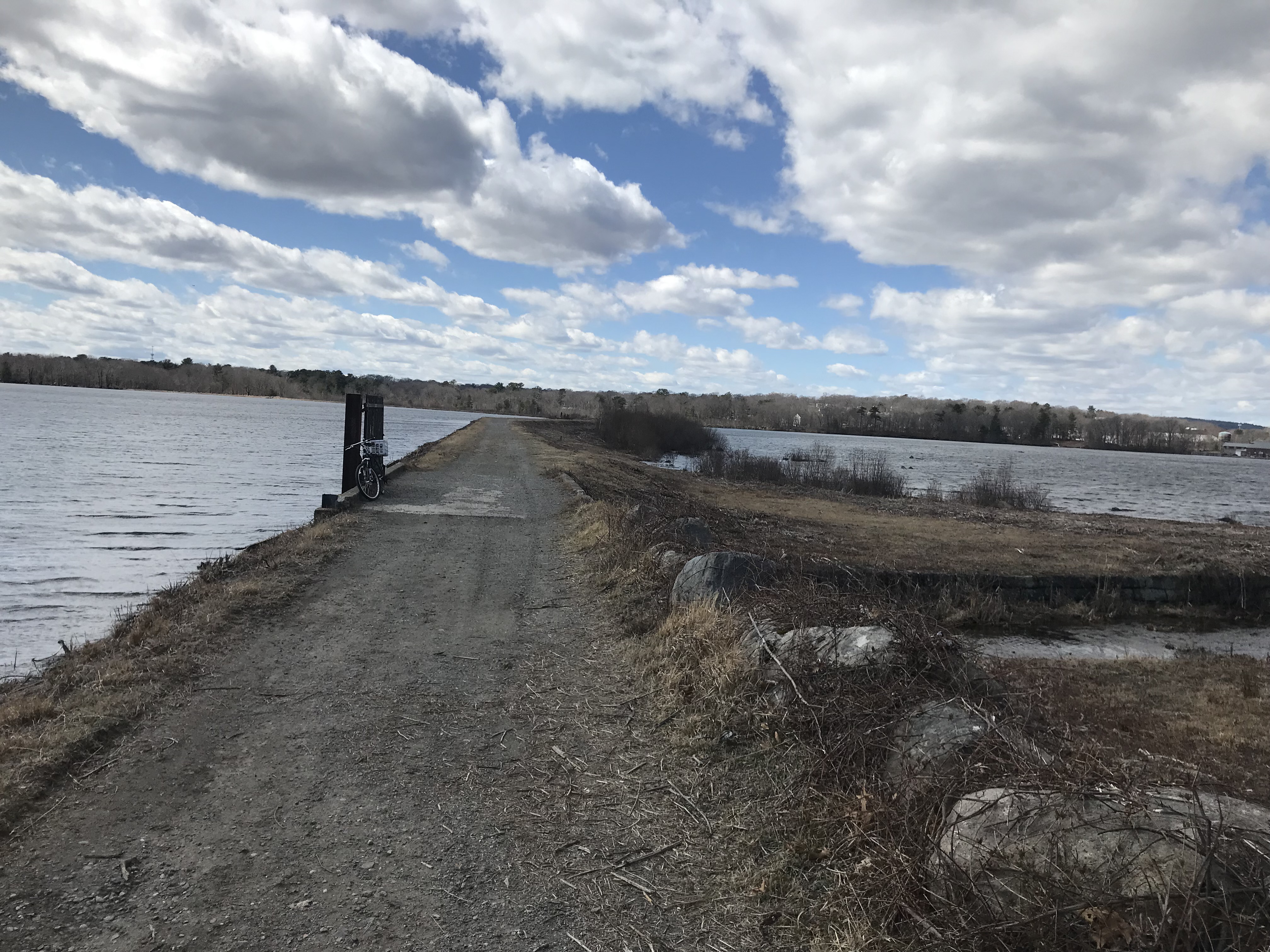 You CAN get to this point without encountering any "No Trespassing" signs if you come over the dam, but it's Braintree, not Randolph, so it's not actually the Randolph Reservoir Walk from the dam to this point. You can see the Randolph-Holbrook water treatment plant way across the water at the left top of this photo. The bicycle is along the main trail and there's a "spur" to the water's edge.