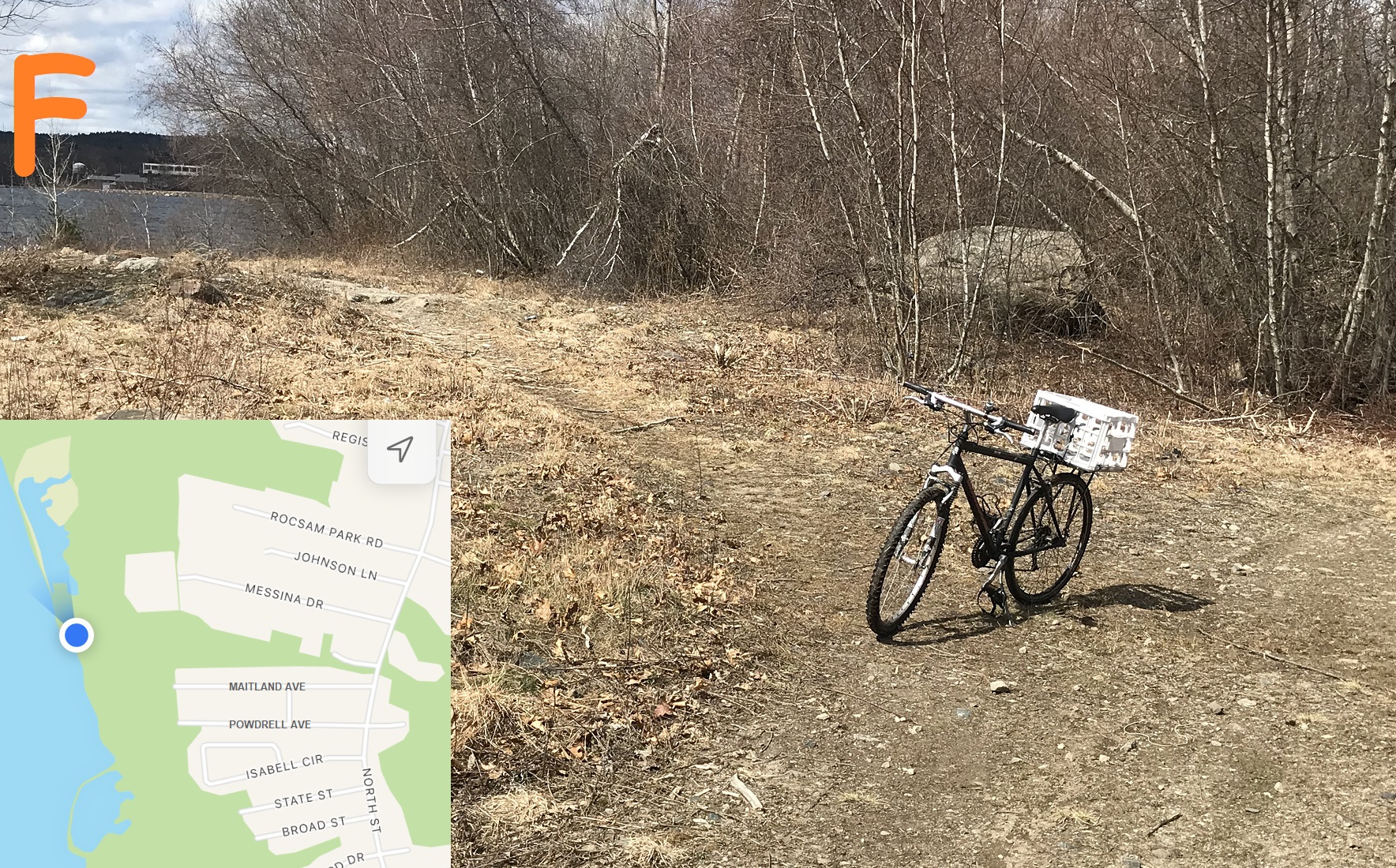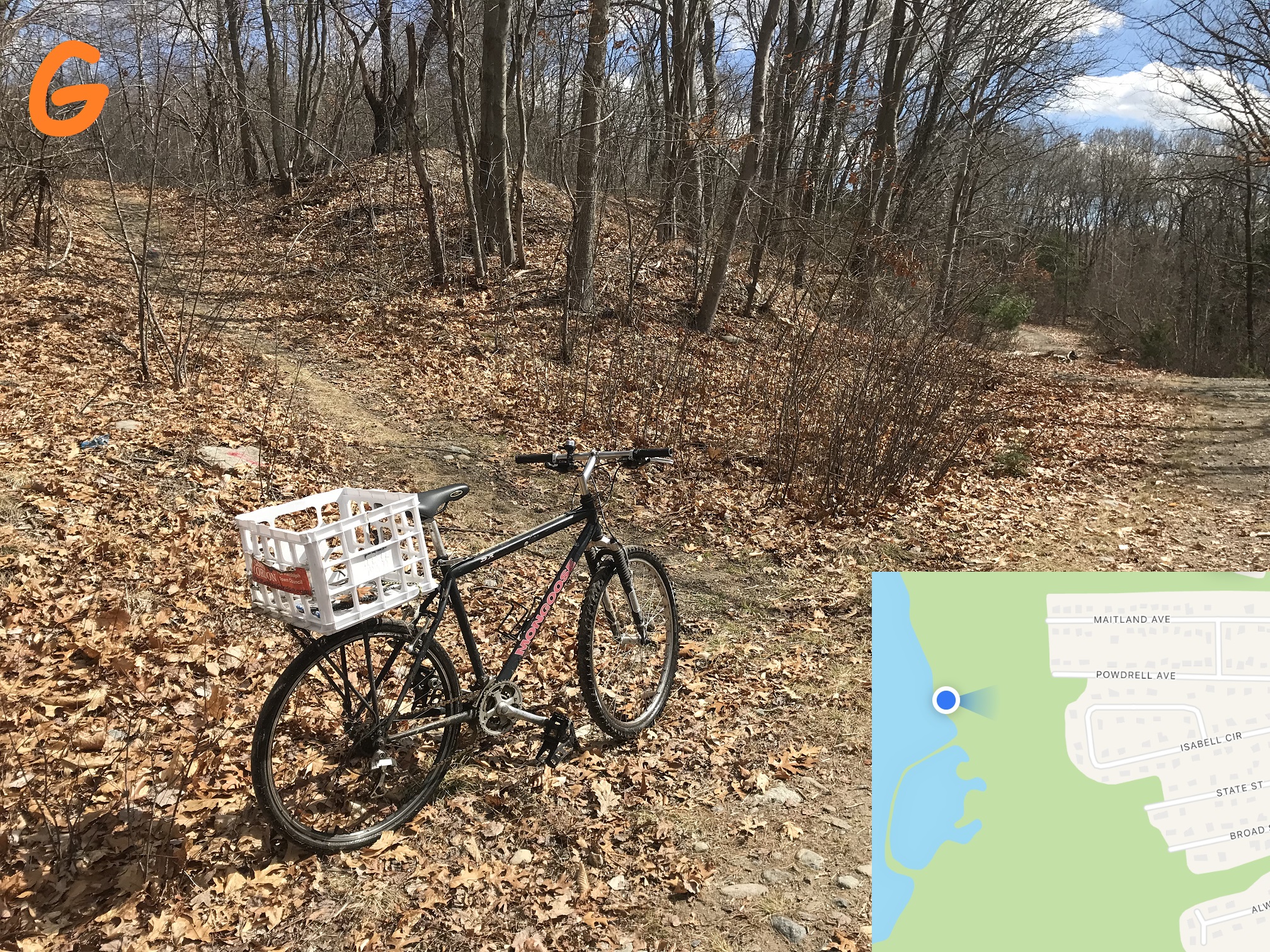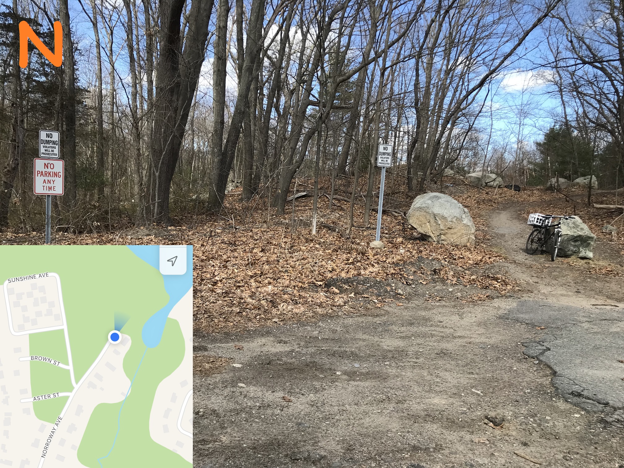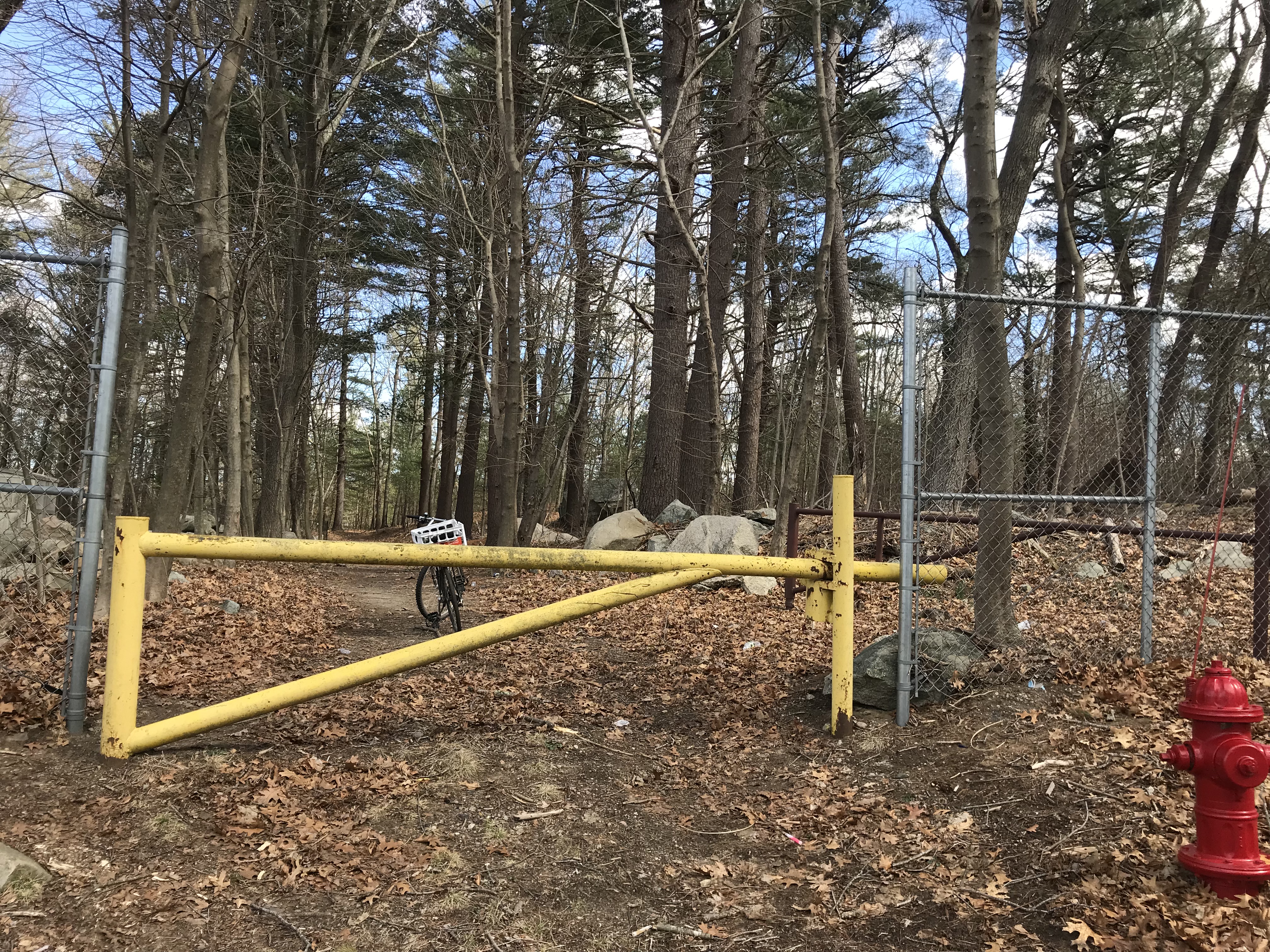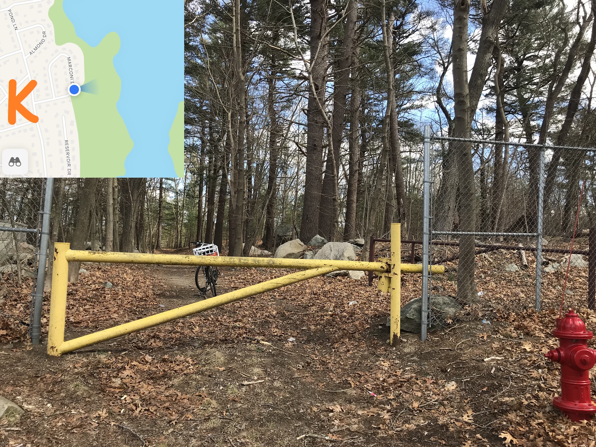 The bike points on the trail to the reservoir -- there are a network of paths in this area but please try to respect people's property by staying on the town side of the property line (The Marconi Drive entrance has some private property fenced off, but many are just open).
