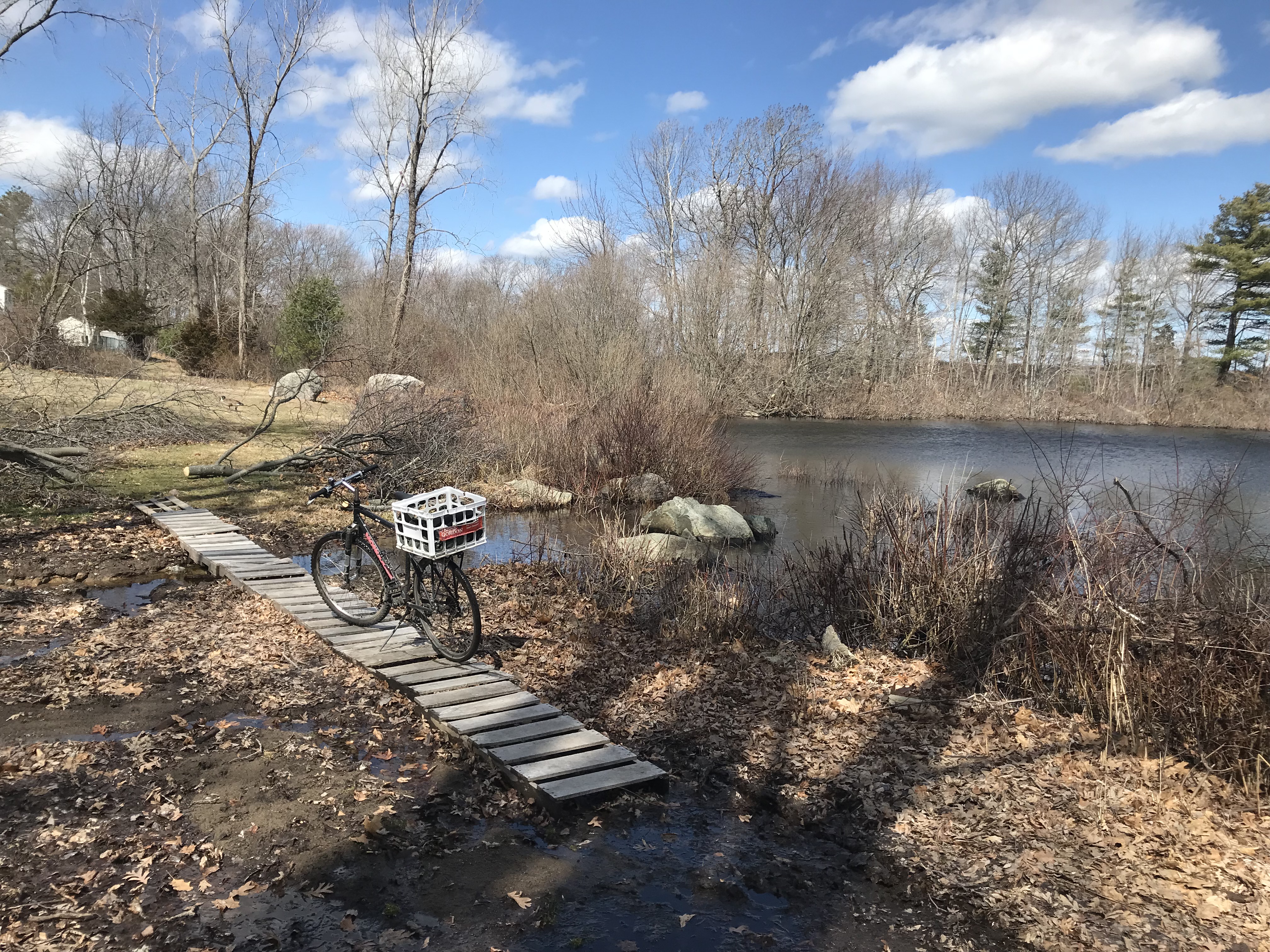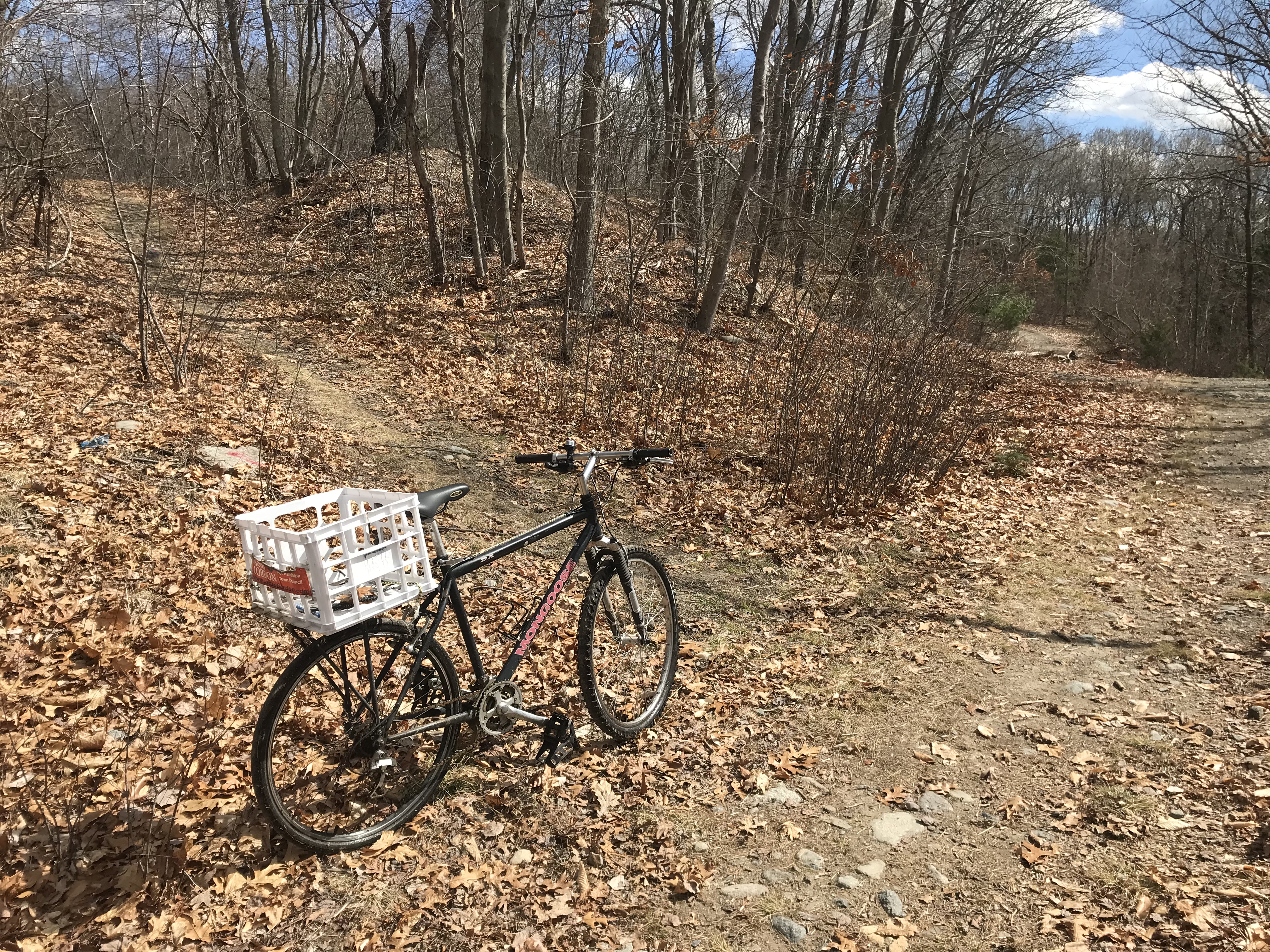 The Fin-Fur-Feather Conservation Area is rough hiking or biking -- wet and muddy if you go off the main trail -- but the main trail is maintained by the Town of Randolph and hence less rough once south of the Braintree border.