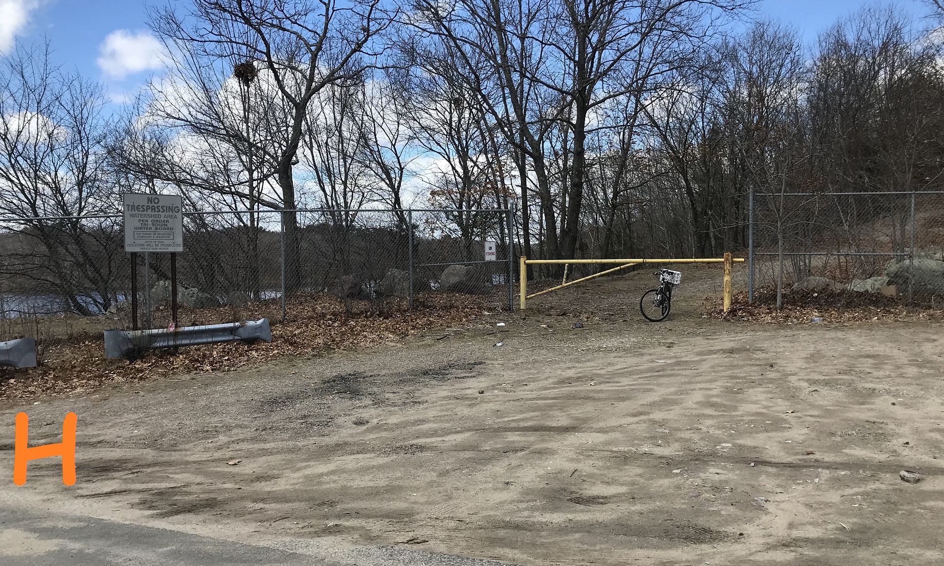 Just about every street adjacent to the reservoir walk has a foot entrance -- Marconi Drive has a large entrance to allow in DPW vehicles when needed. This is all town-owned land -- it's fine to climb over or under the car barrier -- and there's a second barrier to the right (it's brown and perpendicularly behind the yellow one).