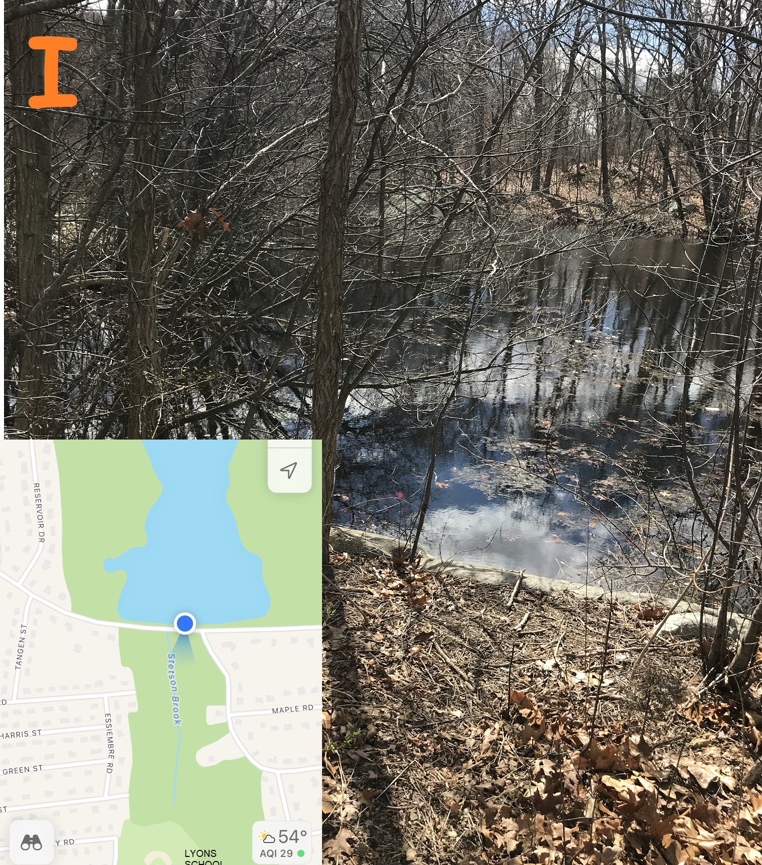 Looking south from Oak Street across the street from the reservoir is Stetson Brook, which is inaccessible but legal fishing as reported on fishing review websites.