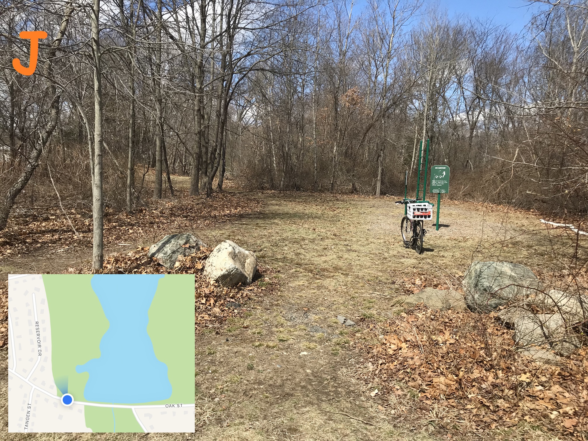You have to walk along Oak Street to connect the "bottom of the figure 6" from the trail east of the reservoir to the trail west of the reservoir (this entrance). Another project -- maybe planned in 2023 and underway in 2024 -- will make a pedestrian trail taht conencts the two halves (and maybe some connection to Stetson Brook too).