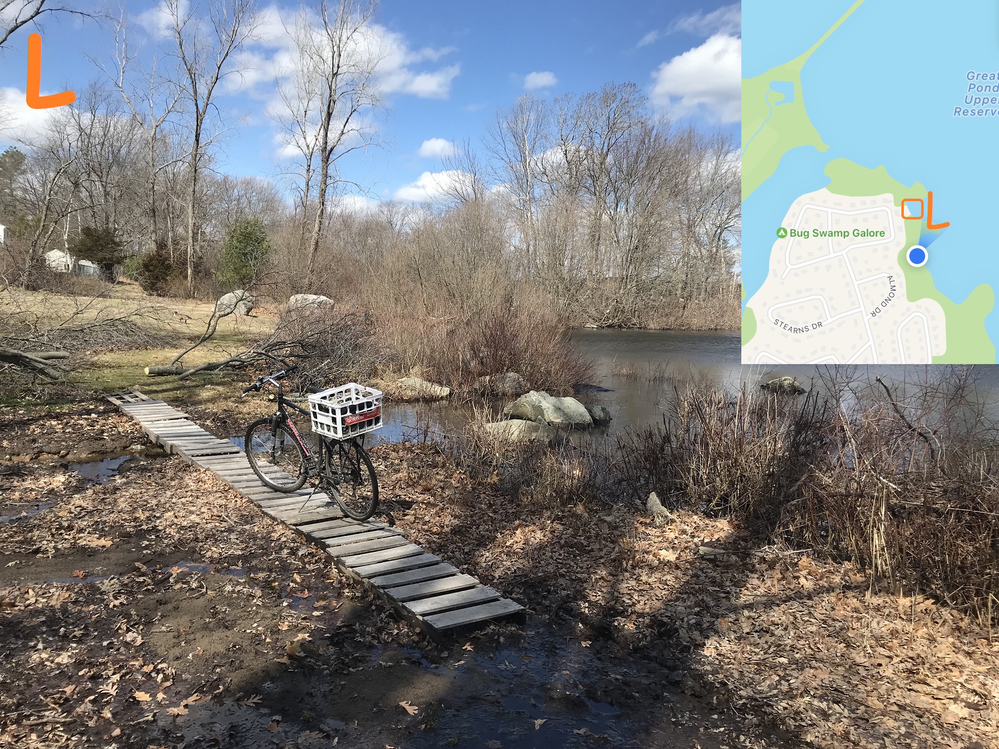 There's a boardwalk here too, but it's maintained by the neighboring resident, not by DPW. This property touches the reservoir (when the reservoir is full!) so please respect the property owner's generously allowing people on the Reservoir Walk to cross (i.e. try not to track mud onto their lawn!)