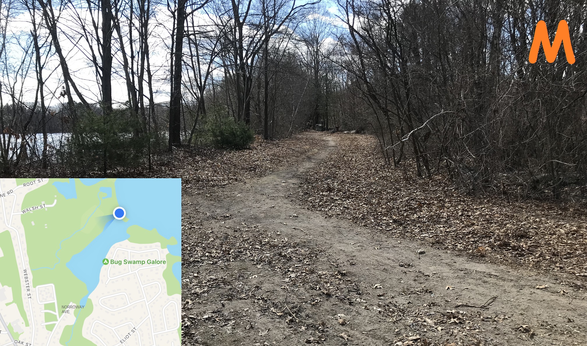 Norroway Avenue is a dead end that lets directly onto the trail shown to point M.
